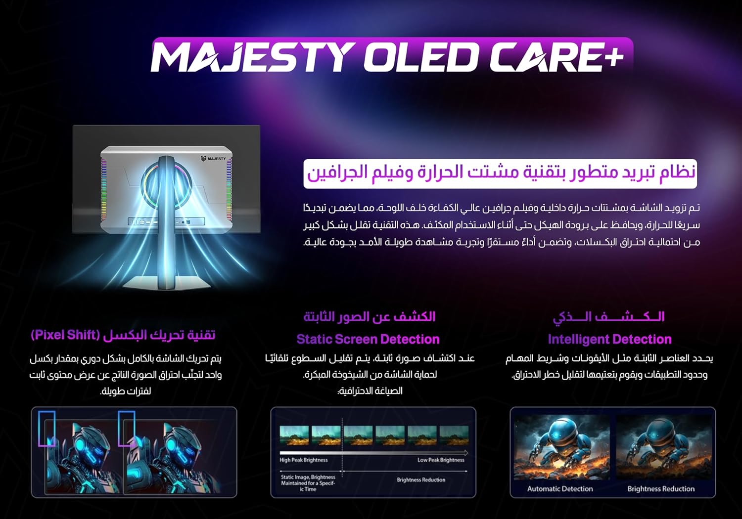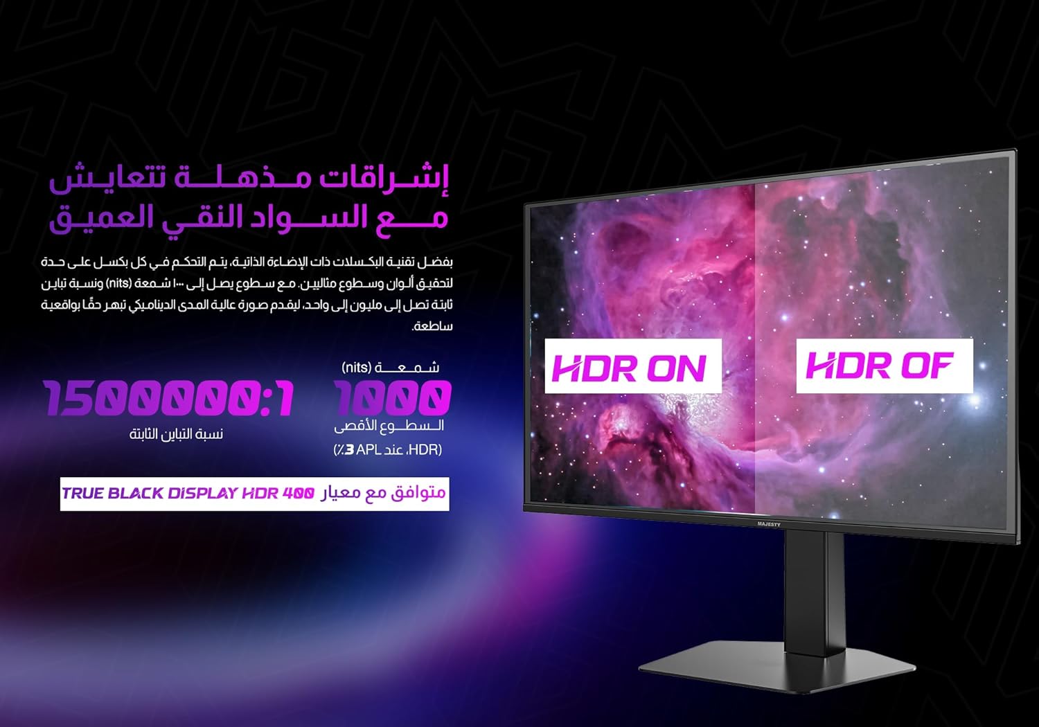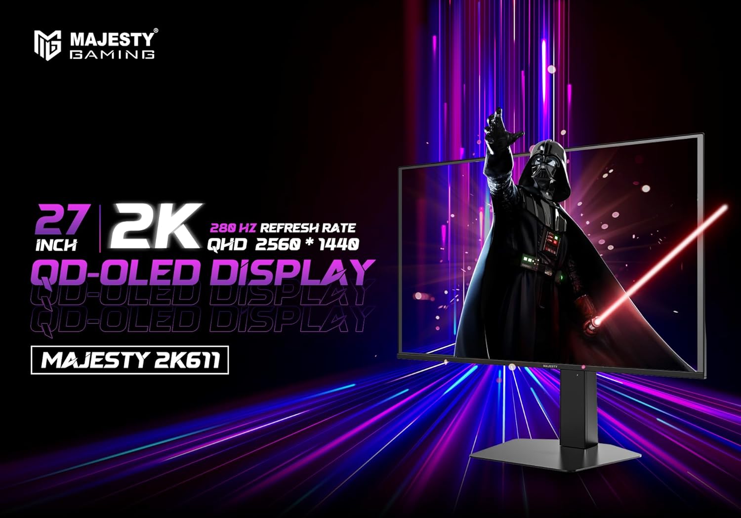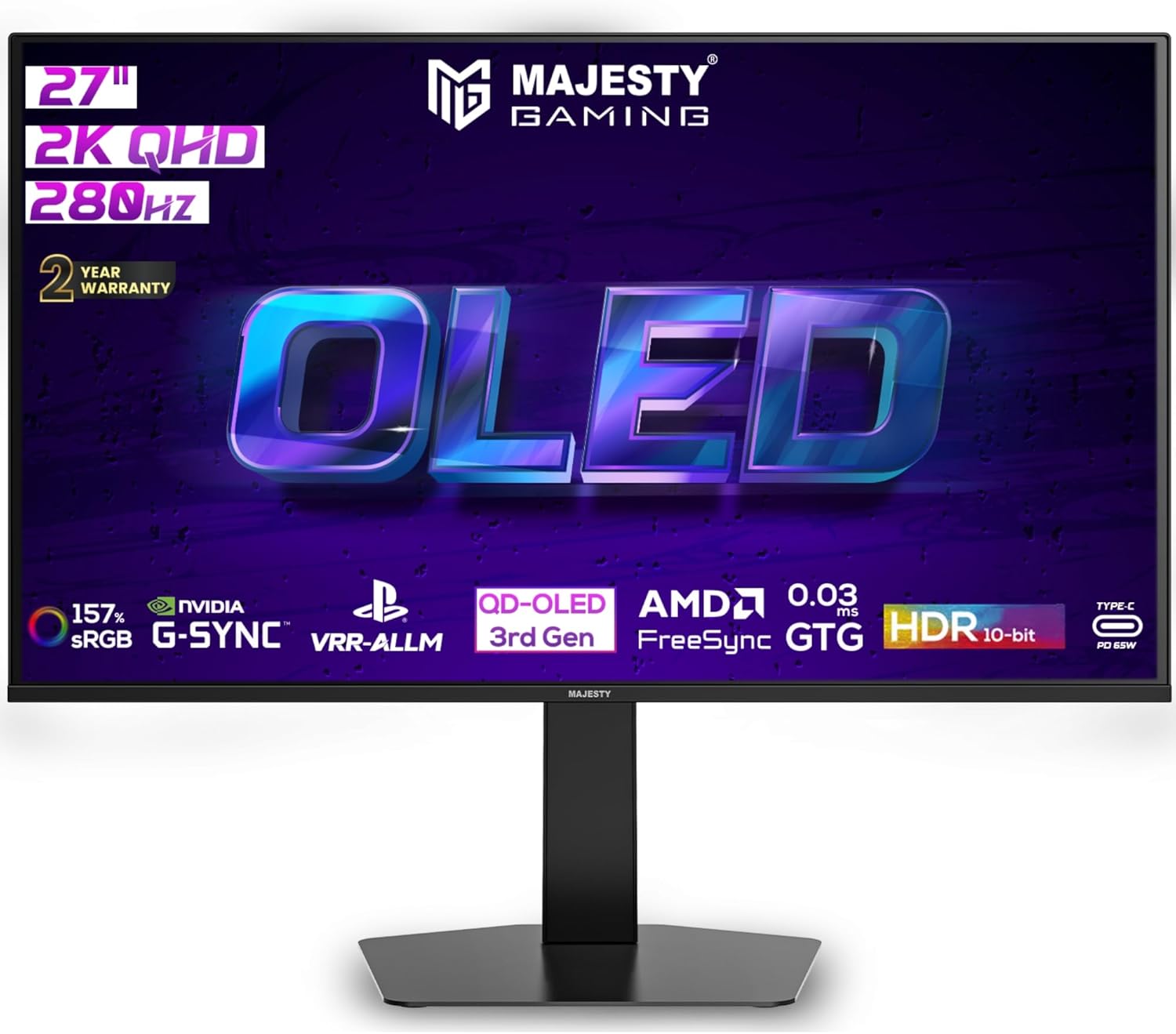 Majesty 27 Inch OLED Gaming Monitor 2K QHD | QD-OLED | 280Hz | 0.03ms | HDR400 | 157% sRGB | 10-Bit | G-SYNC & FreeSync | HDMI 2.1 | DP & USB-C | VESA | Built-in Speakers | RGB Rear | Flexible Stand